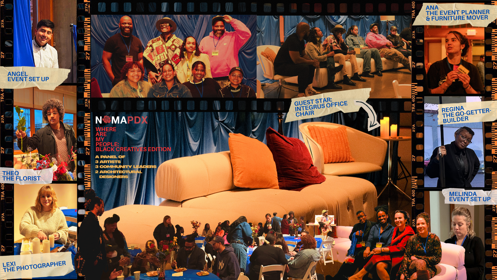 Ana: Bonding with both of you energized pushed me too. When I got home, I kept thinking about how my friend who works at a smaller firm didn’t get to go to conference and how she’s been struggling to find her people since moving to Portland. There are only five licensed Black architects in all of Oregon – and my friend works with one of them but it’s not enough and I feel like she could greatly benefit from entering a room full of representation. So I decided to create something I’ve never seen here since 2023 when we hosted the NOMA National Conference in Portland—a gathering centered entirely on Black creatives. I pulled together a panel of 3 Black artists, 3 Black community leaders, and 2 Black architectural designers and hosted an event called “Where Are My People: Black Creatives Edition.” Theo came down to attend but got dragged into helping with set up, along with several others from our Portland office who volunteered. We filled the room. And for a moment, it felt like the panels we saw at NOMA in KC—grounded, joyful, honest and safe.